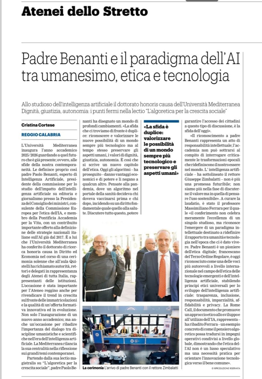 The Università Mediterranea di Reggio Calabria  inaugurated the 2025/2026 academic year by awarding an Honorary Doctorate in Law and Economics to Father Professor Paolo Benanti , one of the most authoritative voices on the international scene of artificial intelligence ethics.