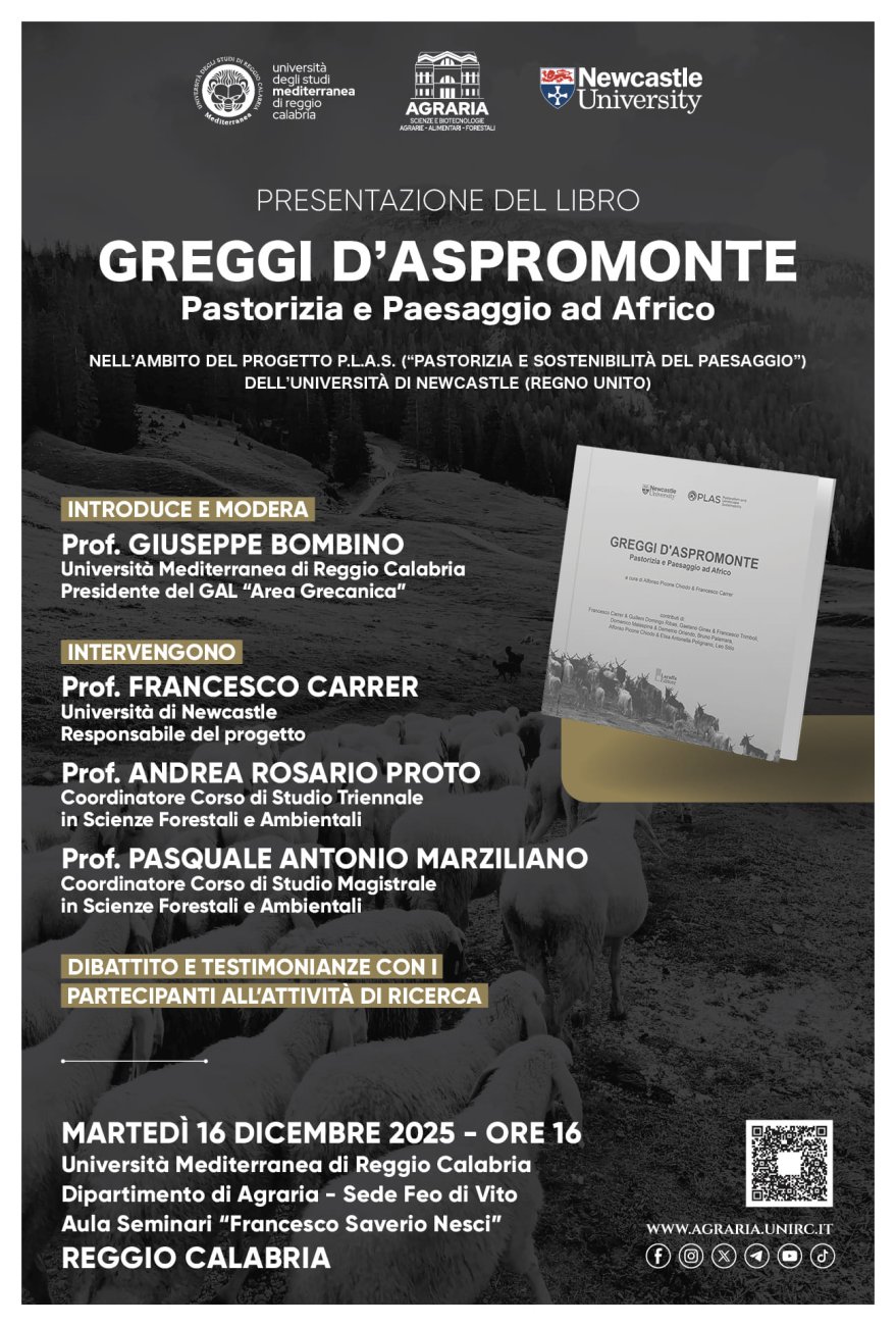 The international commitment to the study of traditional Aspromonte pastoralism continues with the presentation of the book " Greggi d'Aspromonte: Pastorizia e Paesaggio ad Africo" (Sheep herding in Aspromonte: Pastoralism and Landscape in Africo) , edited by Francesco Carrer and Alfonso Picone Chiodo, produced as part of the PLAS project, promoted by Newcastle University. The meeting will be held on Tuesday, December 16, 2025, at 4:00 PM in the "Francesco Saverio Nesci" Seminar Room of the Department of Agriculture at the Università Mediterranea di Reggio Calabria.